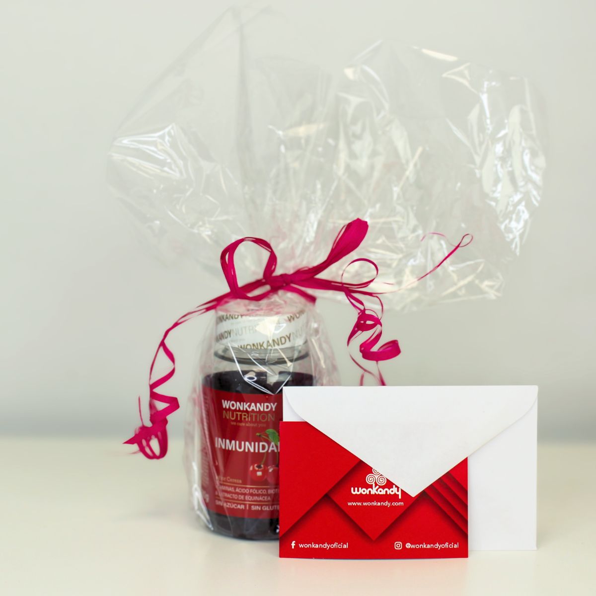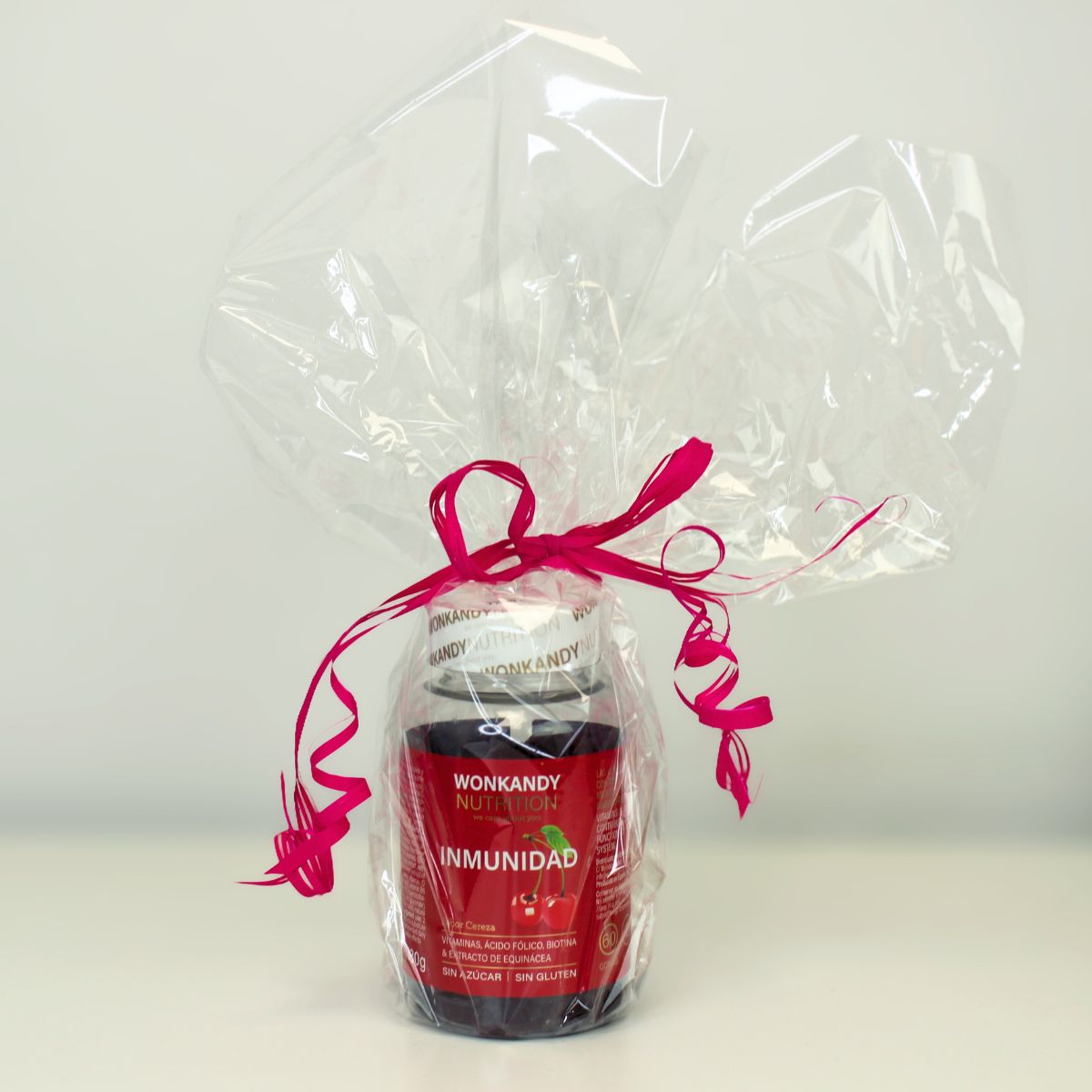 Edulcorante (maltitol), gelatina de cerdo, extracto seco de Equinácea Purpurea (Echinacea purpurea), vitamina A (retinol), vitamina D (colecalciferol), vitamina E (DL-alfa-tocoferol), vitamina C (ácido L-ascórbico), vitamina B6 (clorhidrato de piridoxina), ácido fólico (ácido pteroilmonoglutámico), vitamina B12 (cianocobalamina), biotina (D-biotina), ácido pantoténico (D-pantotenato cálcico), zinc (gluconato de zinc), yodo (yodato de potasio), selenio (selenito de sodio), corrector de la acidez (ácido cítrico), aroma natural de cereza, colorante (carmín). Puede contener trazas de PESCADO.