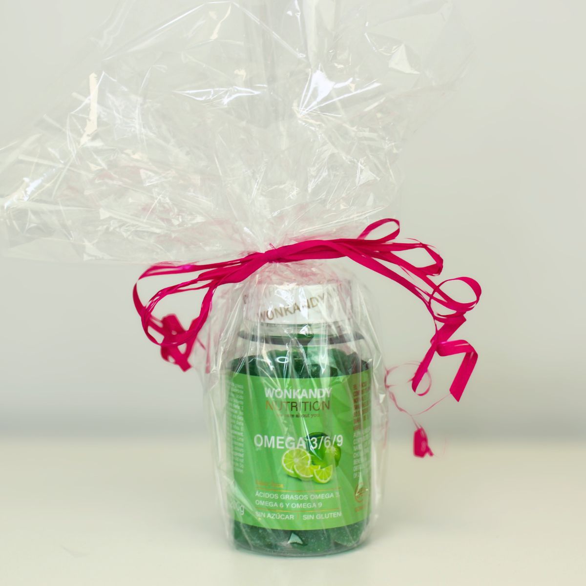 Complemento alimenticio. Caramelo de goma con aceite de perilla que proporciona ácidos grasos omega 3-6-9, y edulcorantes.