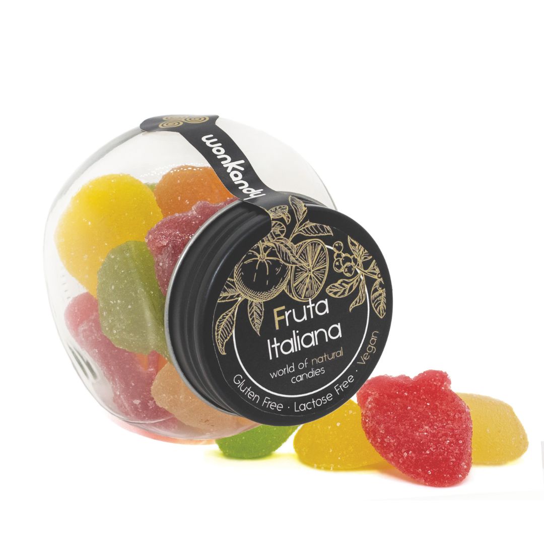 CARAMELOS DE GOMA. Ingredientes: Azúcar, jarabe de glucosa, agua, gelificante (E440), acidulante (E330), aromas, colorante: curcumina (E100), azul brillante FCF (E133), extracto de pimentón (E160c) y antocianinas (E163). C